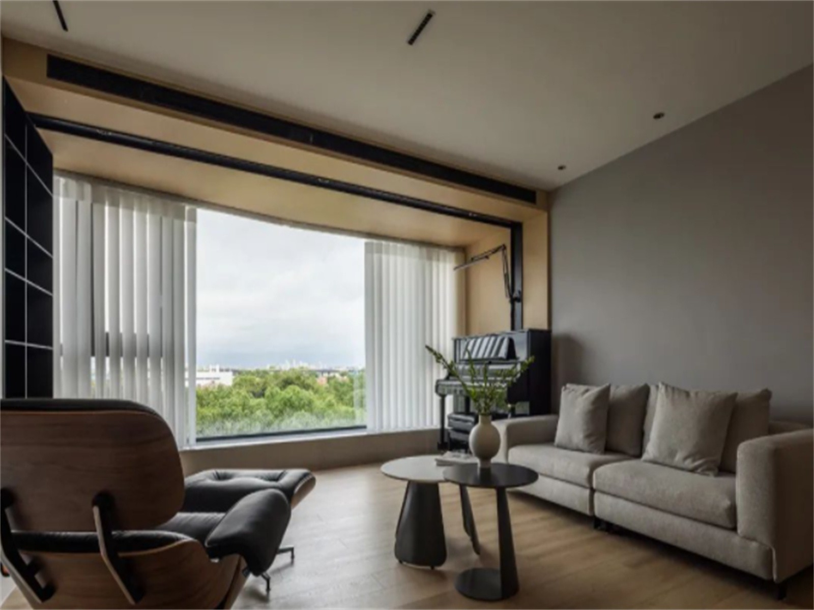 客厅,大面玻璃窗将阳光和风景尽收眼底,局部木饰面包裹的墙顶面散发温馨气质