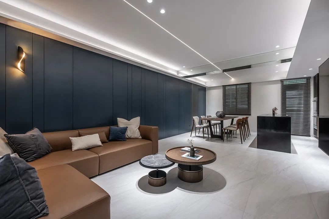 天花一道细长灯带穿梭于顶,下方以深棕色皮革沙发,与前后侧翻折的线性灯带呼应,悄悄点亮生活轨迹与家具,并勾勒科技感收放质感。