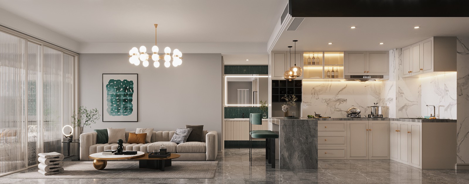 客厅区简介明快,主色调为浅米色和灰色,软装点缀金色金属质感的灯具,达到增加空间片质感的效果。
