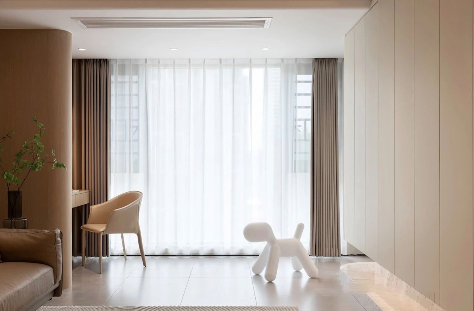 客厅与阳台之间的承重墙通过弧形木饰面包裹装饰