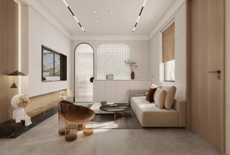 客厅为了光线更好,采用了玻璃砖建墙,同时做了一个弧形门洞,使得空间更柔软舒适,地面采用了原木地板配以原木色门