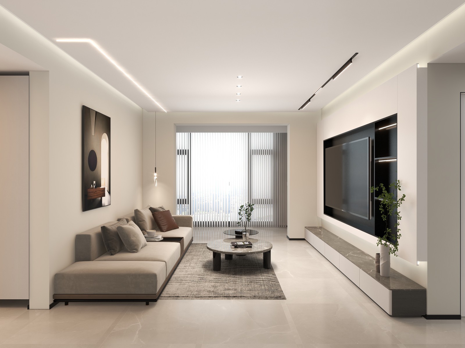 客厅天花运用无主灯的设计,更简约轻松,整体以大手笔的统一色调的不同质感,在小装饰上尽可能选取精致的物件。