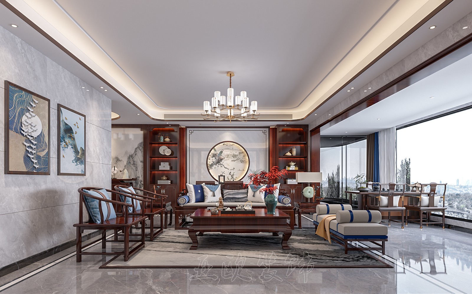 红木映衬下 更显雅致,深而不沉 彰显着中式的韵味 塑造出端庄大气 华丽典雅的气质。