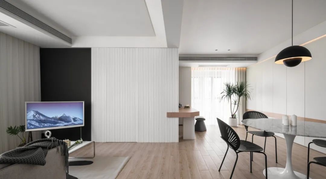电视背景由简单的黑白两色构成,隐形门设计保证了背景空间的连续性。