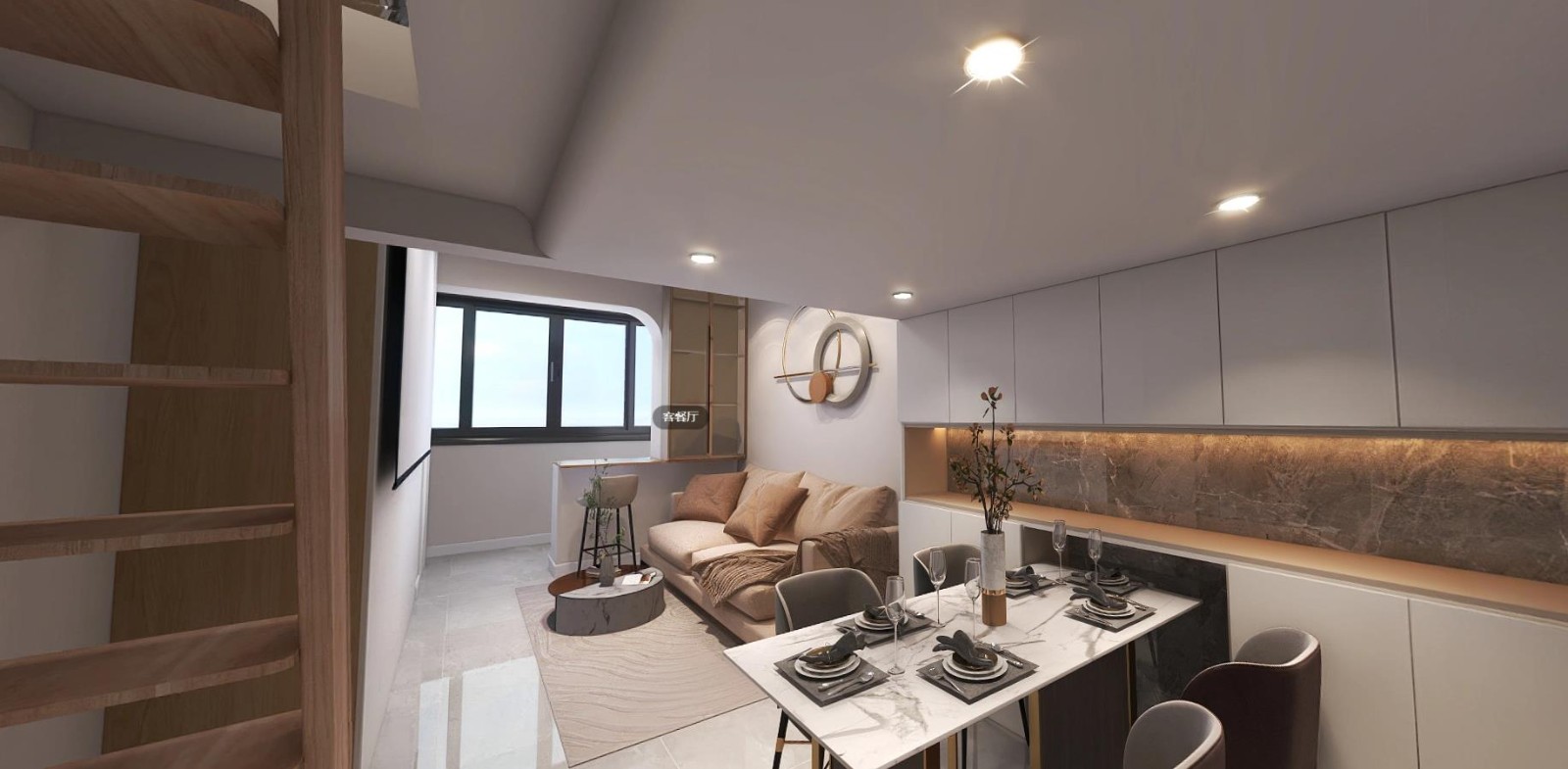 餐边柜采用仿大理石板材做反差。顶面做圆弧高低吊顶,提高层高。