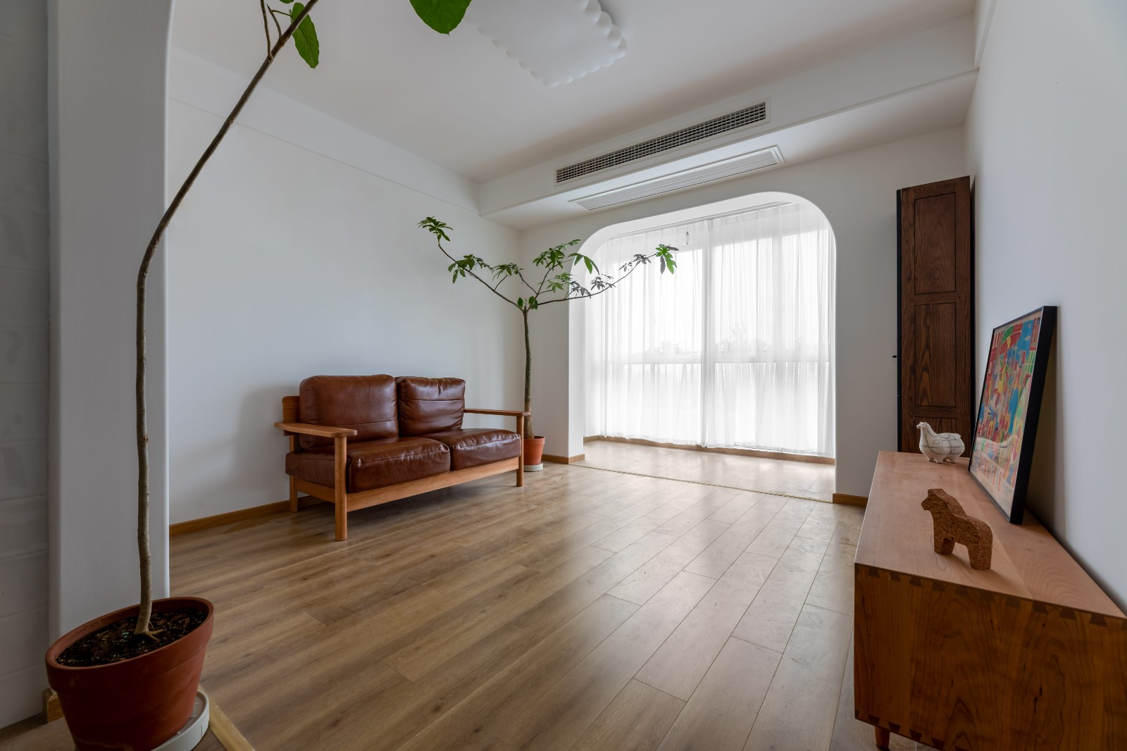 客厅和阳台联通起来,厅堂更显宽敞明亮。阳台用白色纱帘过滤自然光线,让客厅白天光线更加柔和舒适