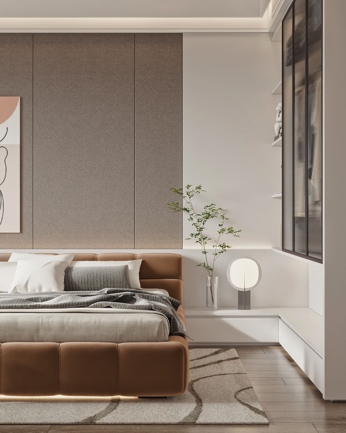 卧室做了硬包加护墙板背景,定制衣柜结合床头柜