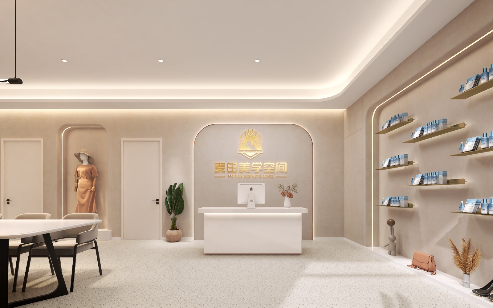 前台门厅设置商品陈列展示区域,为客户提供全生态、全链路美容产品展示
