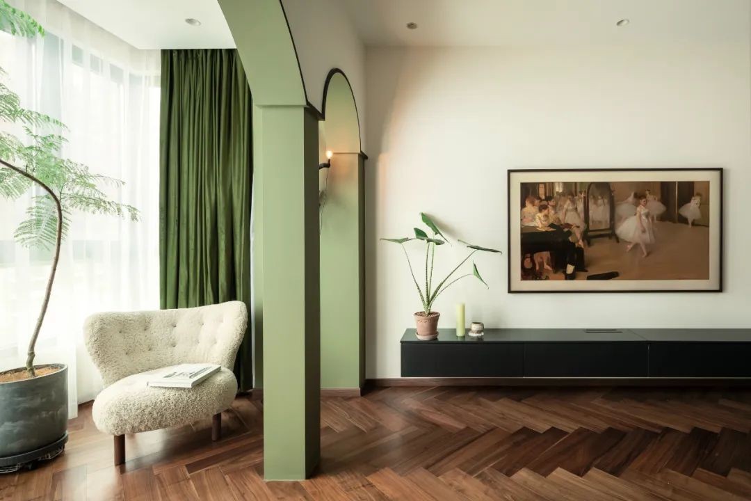 ①在原本的布局中,储藏室处于客厅、餐厅与卧室区域的中心位置,现在让面积给卧室,并在中间腾出壁炉的位置; ②阳台增加拱形建筑隔断,优化原空间建筑和布局; ③巧妙拆解布局功能,既兼顾收纳储物,又保证了空间感。