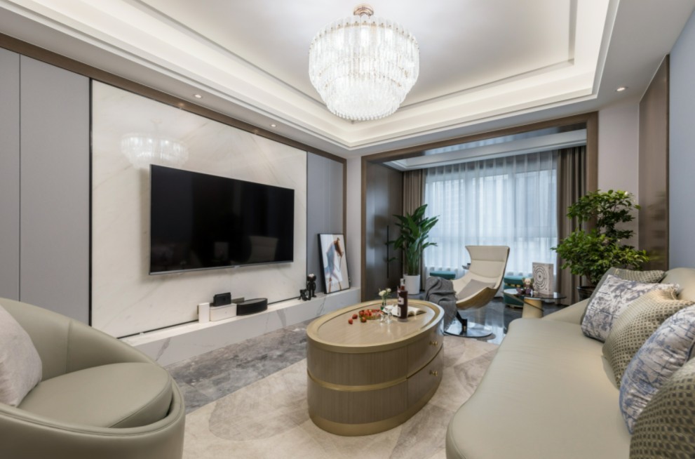 客厅整体的色调偏理性,沙发的背景墙使用纯色岩板,简约大气;