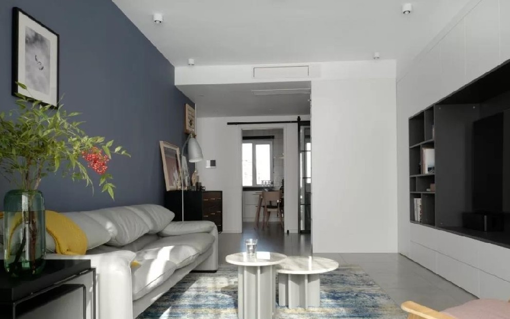 沙发背景墙选用饱和度很低的灰蓝色,搭配暖灰真皮沙发,从中点缀暖黄、少女粉,仿若海面泛涟漪,波光迎暖阳;