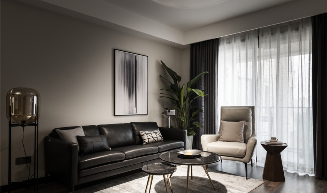 铅黑沙发搭配灰白地毯,加上简单干练的茶几,结合在一起让客厅更加和谐。设计师考虑到业主客厅使用的是便携式投影仪,客厅吊顶设计了无筒灯,中心区域无主灯设计,双头明装格栅灯简单实用,更能体现整个空间的层次感。