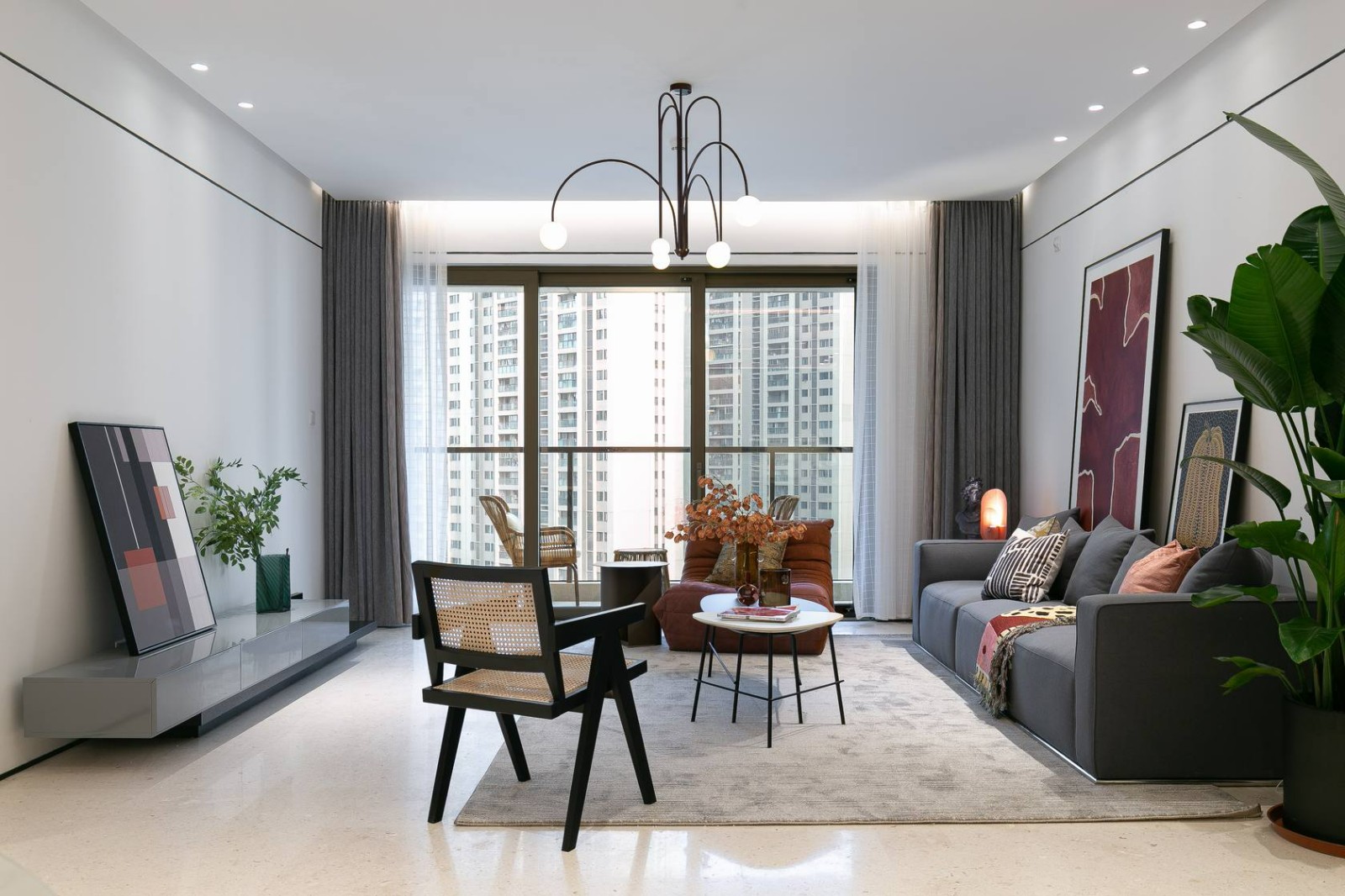 客厅的整体色调以白色+灰色为主,诚然在华润城黑白极简的硬装基础上,我们需要为它注入鲜活的色彩,所以在空间中的软饰,我们用了大量的红色来点缀。在视觉焦点的沙发区域,用大幅的挂画来营造视觉的冲击感,以及塑造空间的艺术感。