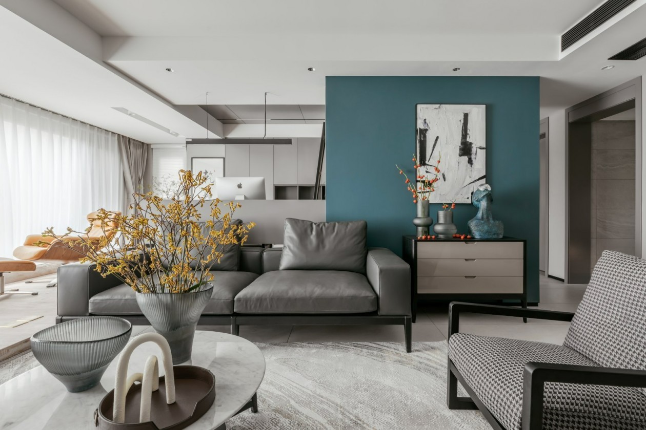 整个客厅以灰色作为基调,和谐统一,从进入空间的一刹那,视线毫无阻隔,大面积落地窗开阔明亮,电视背景收纳柜满足了功能与美感的协调,没有过多的造型和装饰,一切从简约出发。千鸟格扶手单椅,将永恒经典和时尚相结合。家具陈列考虑其必要性,力求让空间更加利落,将空间还给人,感受宽广的尺度和身体的舒展。