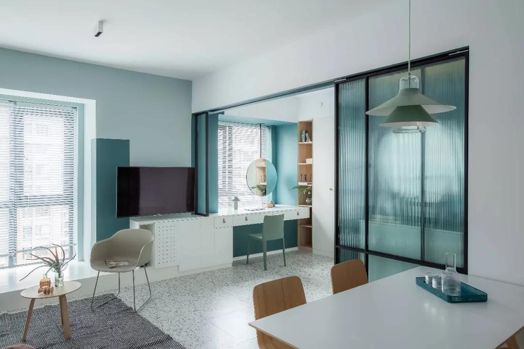 客餐厨一体,将阳台打通纳入室内,沿窗打造U字形卡座