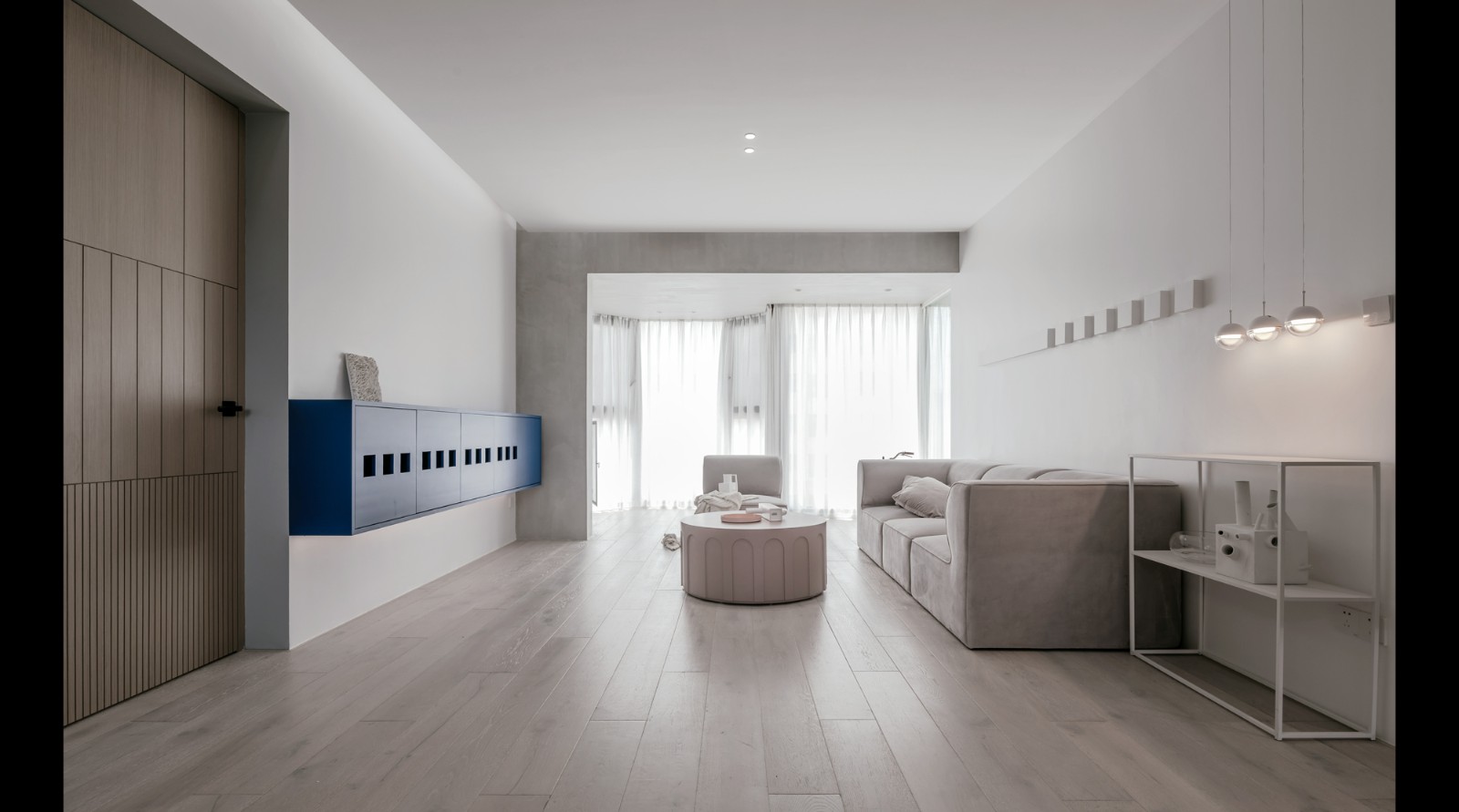 蓝色的玩具柜打破了电视视听墙的限制,方格子的门扇,是给孩子摆放玩具和故事会书籍的大盒子