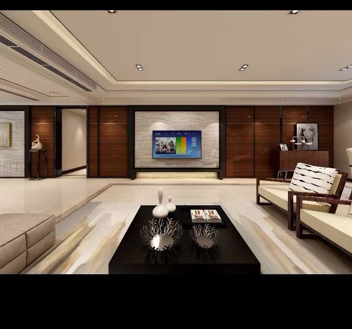 在材质上选择了比较温和的木饰面板加钛金条的组合
