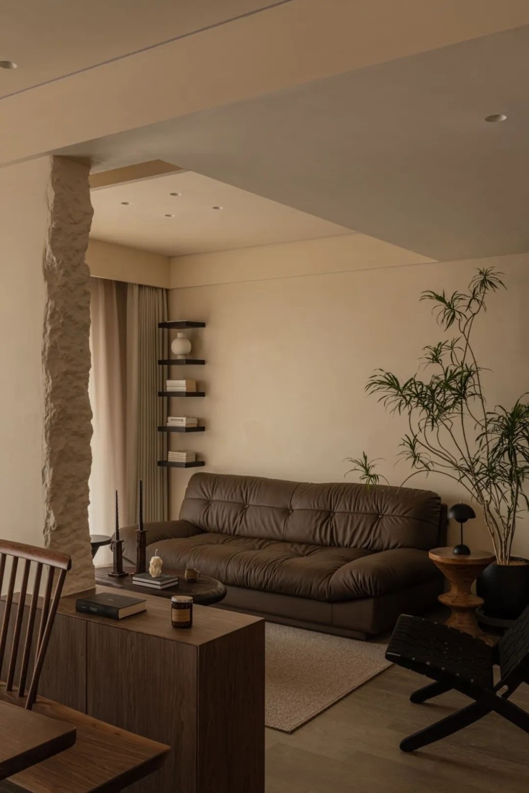 往内空间走去,素净的墙面,木色的家具,棉麻的纱帘,亦或是案几上的一杯茶盏,无不透着独特的“侘寂”之美。