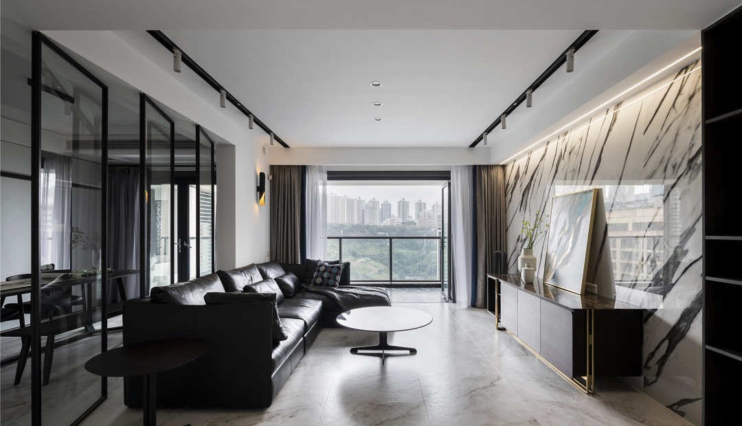 客厅抛弃了传统的主灯,两边采用灯带和轨道灯,中间采用铜灯的设计。灯带和射灯突出背景墙,让空间看起来更大,有层次有重点。 客厅和茶室的墙拆掉,不仅淡化了过道的感觉,整个空间打开后让空间更加大气,利用率更高