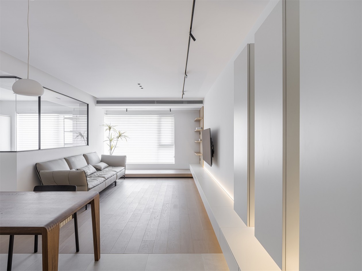 进门见厅,没有传统的玄关设置,而是隐藏了一个独立的入户更衣区。让连上十几小时班回家的业主能最快速度地换上家居服把自己放倒。同时,南面充足的采光也能直接贯穿整个公区抵达玄关。