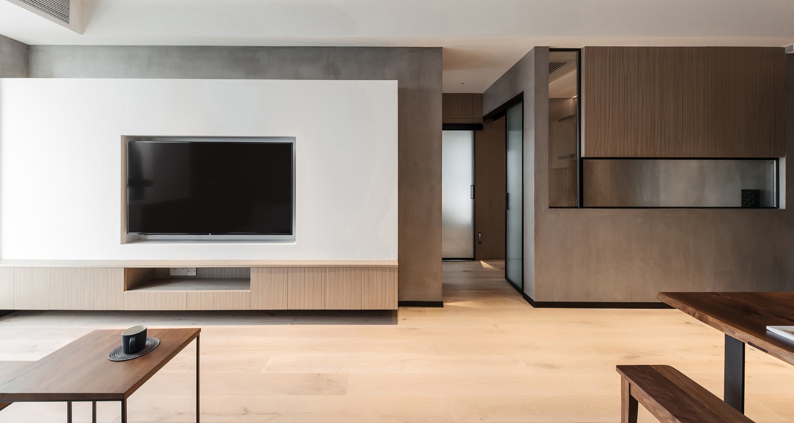 现代原木风客厅,大面积采用木纹装饰,加以局部对比色点缀