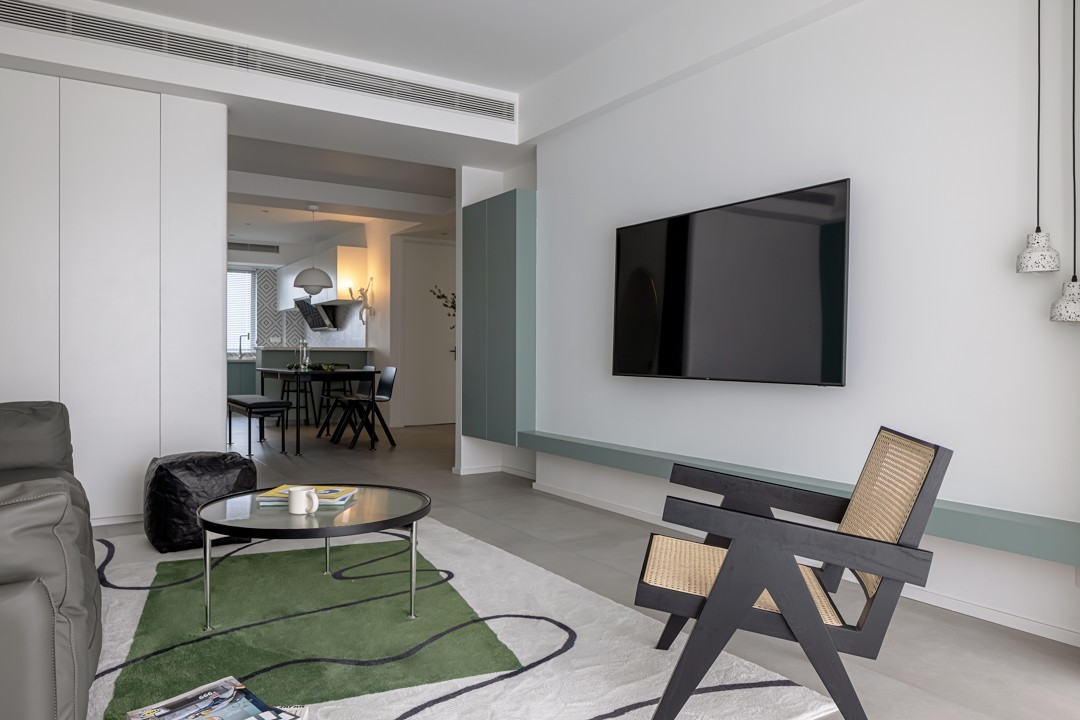 客厅同样用绿色作为点缀,将阳台并入拓展面积及采光,同时,增加了储藏柜作为收纳空间。
