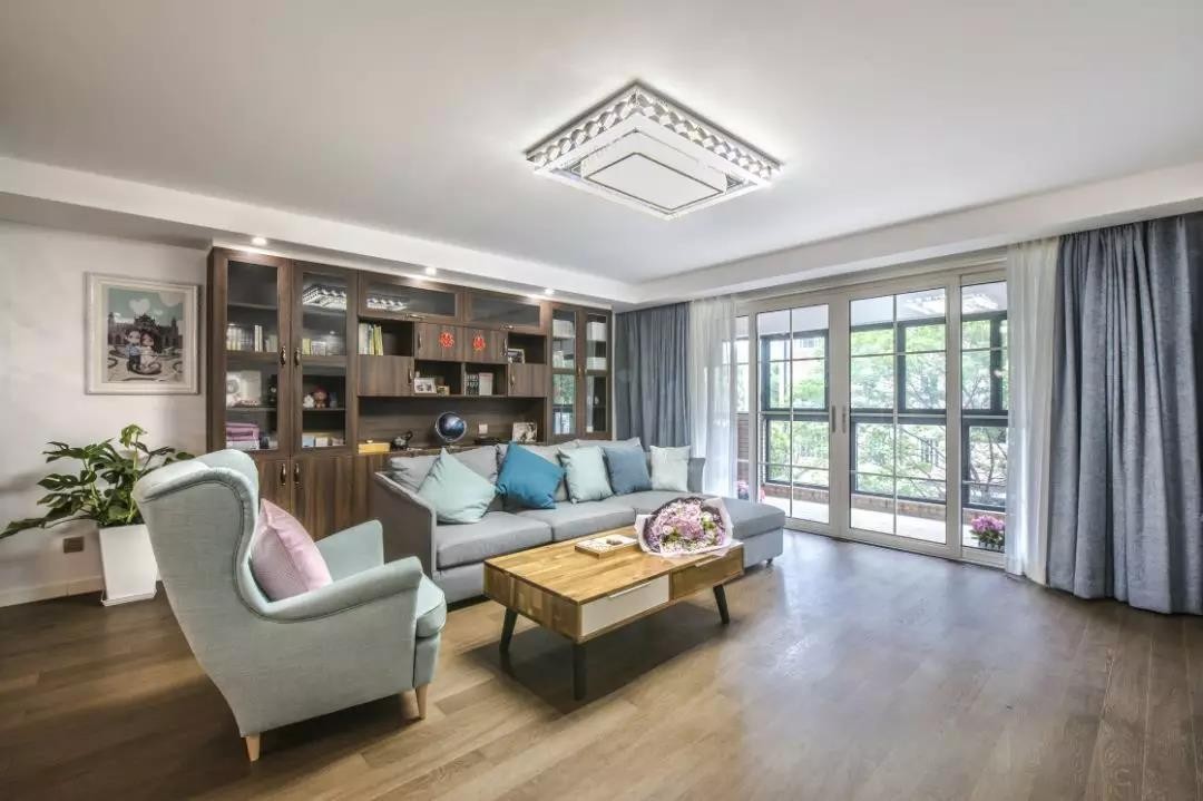 客厅以雾蓝色和白色、胡桃木和白橡木作为整个空间的主调,还原了自然北欧风,雾蓝色沙发在整个客厅空间中起到了吸睛点缀的作用。