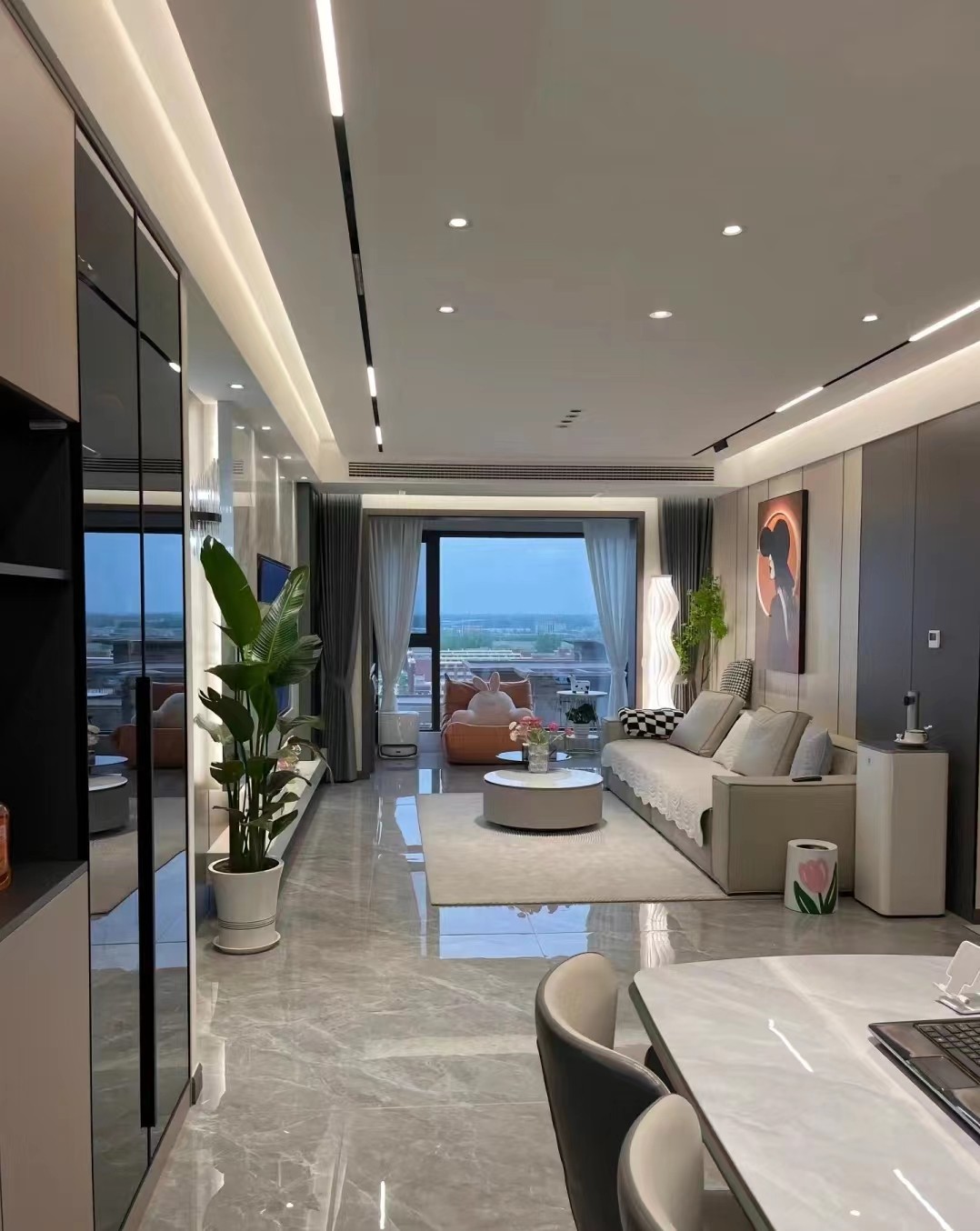 灰色的硬包和格栅加上简约的吊灯柔和暖白光来营造温馨的氛围。
