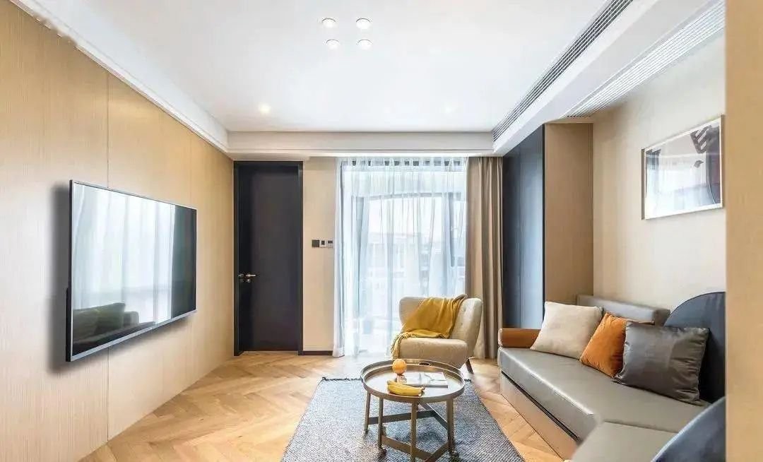 进入玄关就来到异型世界,斜切45度的墙面用木饰面装饰,给客厅留了一丝神秘感。客厅,没有安装大吊灯,采用无主灯照明设计,让空间看起来更通透宽敞。