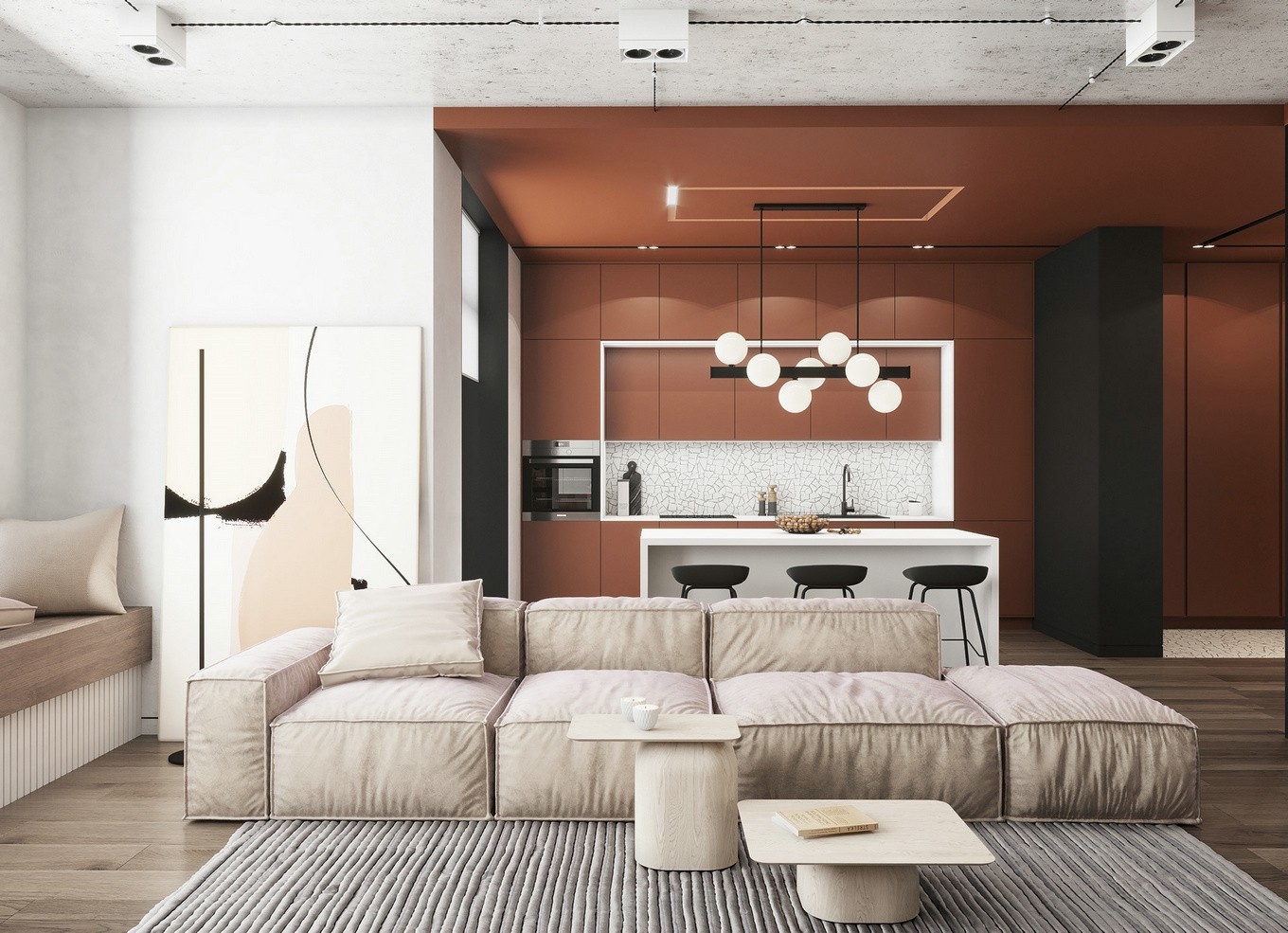 餐厅上方的餐灯与小巧的方桌搭配,让客厅区域变得小巧温馨
