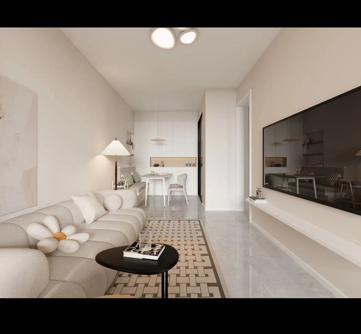 客餐厅区域的话因为房屋的进深有限,尽量选择浅坐深的沙发以及简约的电视背景设计,餐桌结合卡座形式,减少空间的浪费,增加空间的利用率。