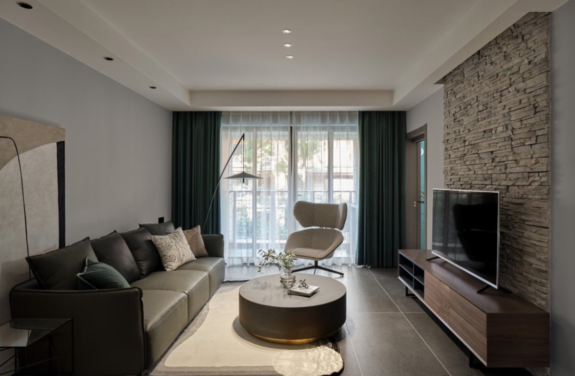 深灰色仿古砖配上浅灰色的乳胶漆,摒弃复杂的墙面造型,斑驳的电视墙在灯光的照射下和细腻的乳胶漆形成强烈对比,让空间更显层次感。