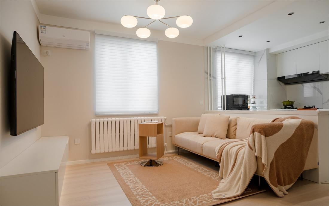 客厅墙、顶面通刷奶油色漆,横铺的燕麦色地板,更换为纵向铺贴的浅木色,空间极尽温柔舒适。圆润可爱的柿子吊灯,取代压抑的吸顶灯,为天花板留足了呼吸感。