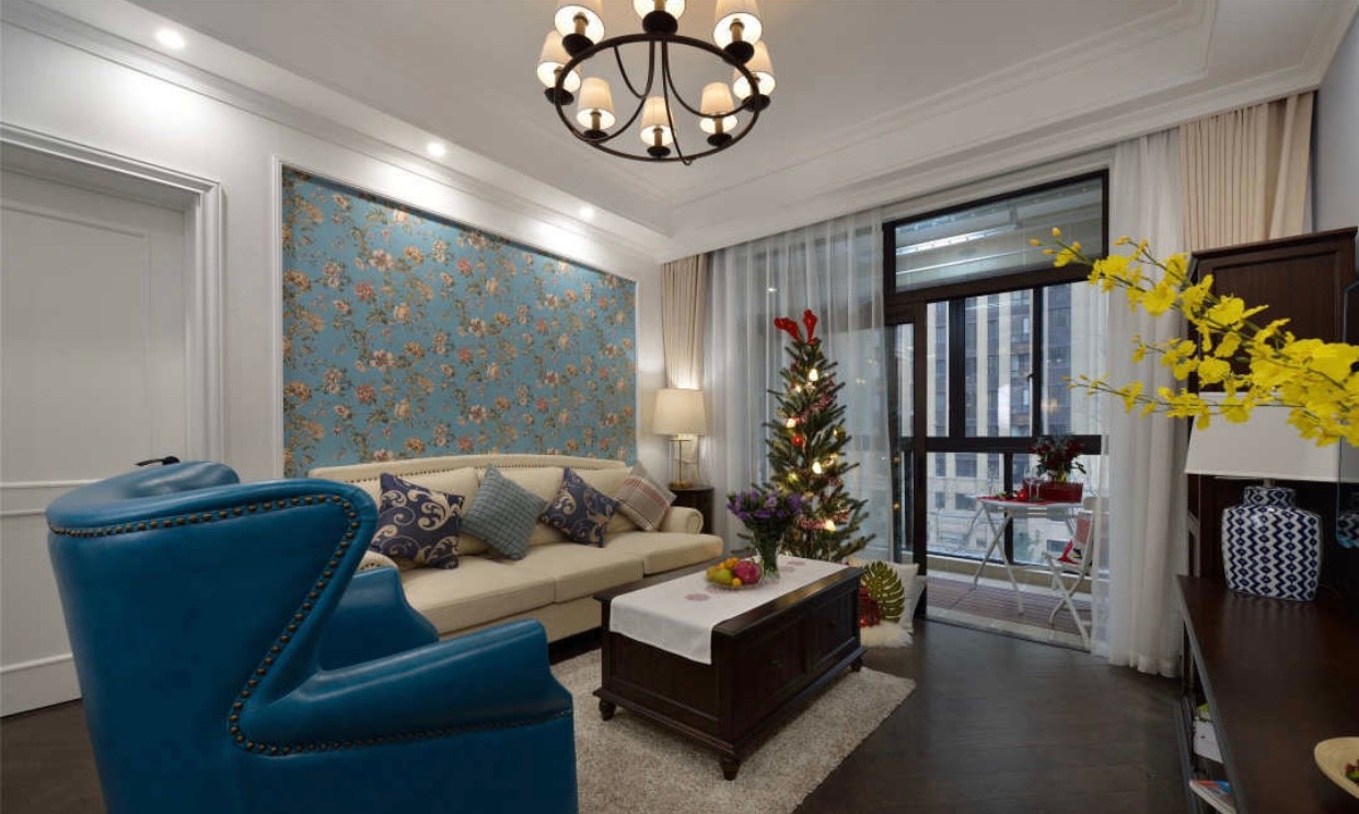 设计师在软装方面下足功夫,复古蓝、石膏线、打造浓郁美式风婚房!