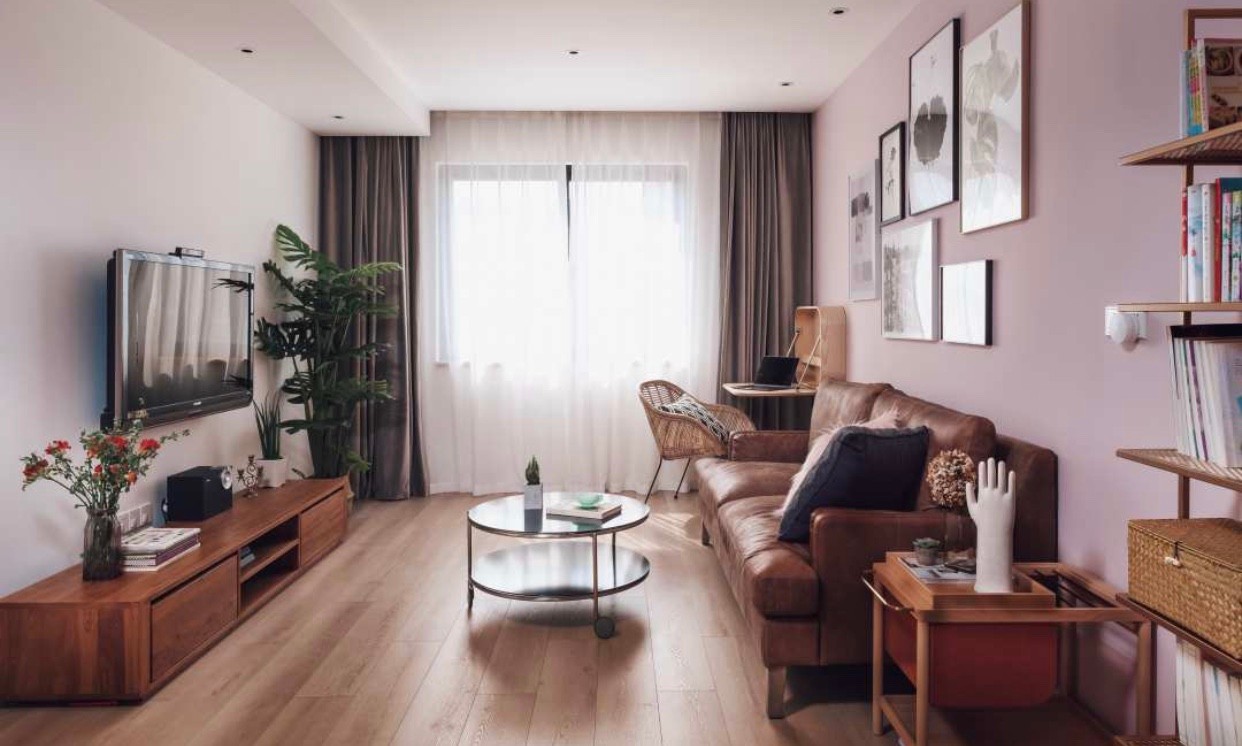 客厅,整体以粉色与哑光白为主。