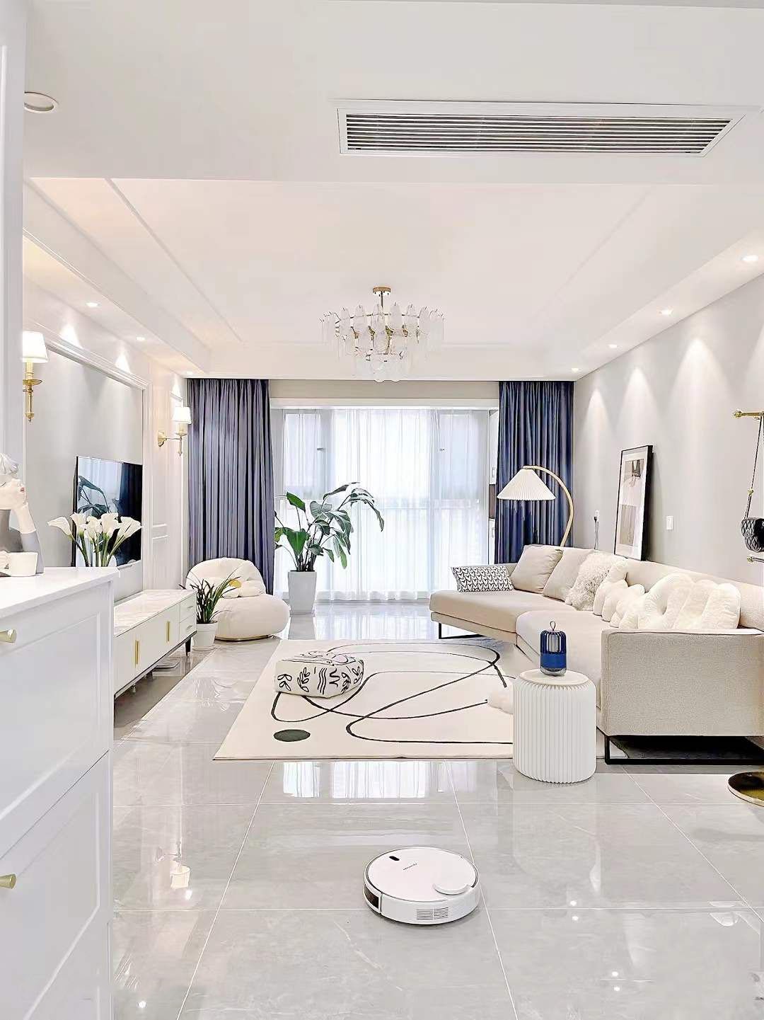 没有做复杂吊顶,因为有中央空调的缘故,只在四周做了边吊, 贴着顶部做了一圈双眼皮,这样简单美观,不影响层高!电视背景墙用护墙板在两边做了简单造型, 中间镂空部分是灰蓝色墙布,这样做厚度几乎可以忽略,不占空间,沉稳简约。沙发背景全部为浅灰色墙布,没有任何造型,仅仅是射灯打在上面就很出效果,温温柔柔很***!