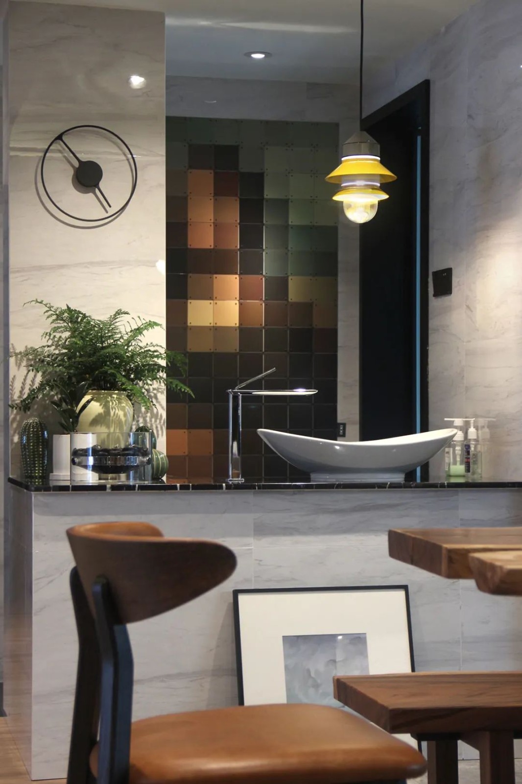 多种材质在客厅这一区域相互作用,是对设计师空间与材质的把控以及灯光运用的考验!厚重的重金属的加入与大理石温润质感的墙面产生了强烈的肌理碰撞 而对面沙发区的木饰面背墙,又以一种中性的存在起到了些许调和的作用,正所谓粗中有细,刚柔并济。