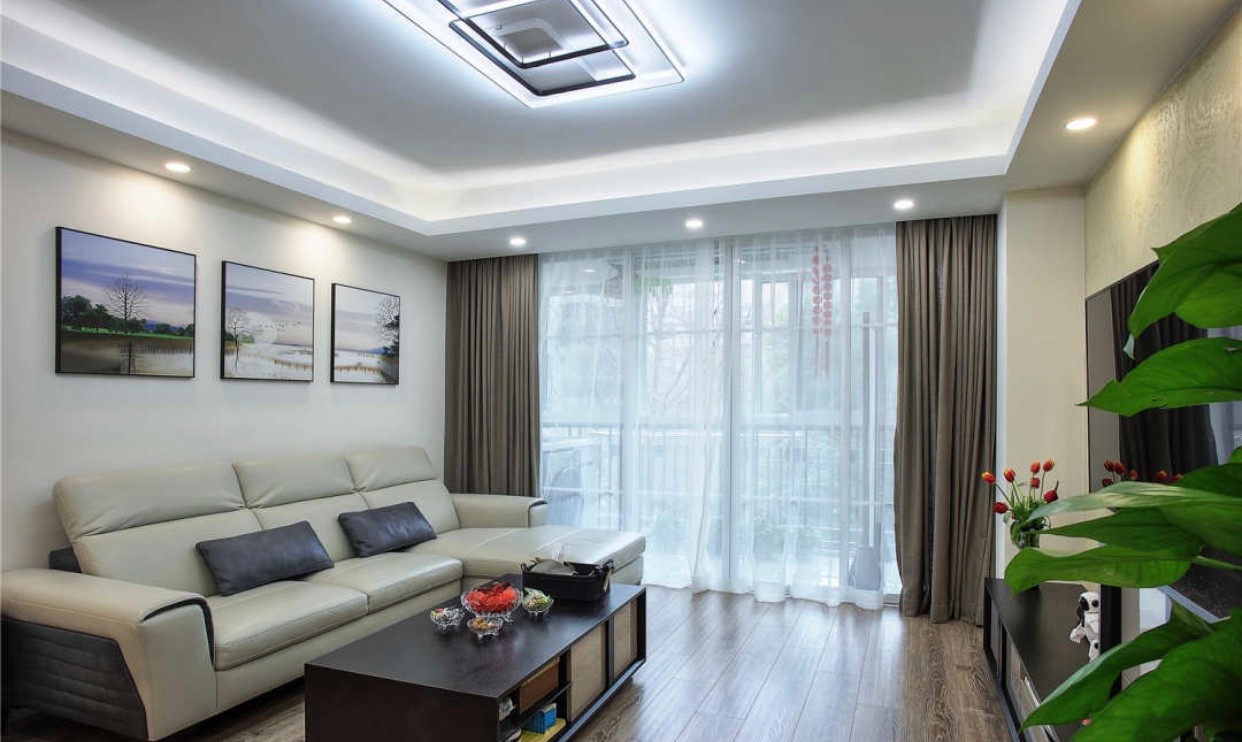 米色的皮沙发搭配棕色窗帘,客厅显得格外温馨。