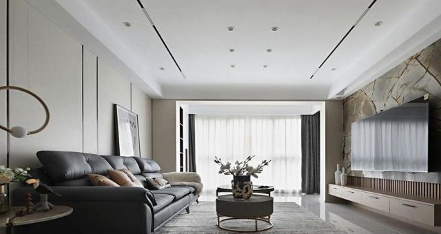客厅是简单为主的现代风,平面式吊顶搭配无主灯设计路线,不压低层高感营造出轻松舒适的居住氛围,大玻璃落地窗可以让你在家就能饱览四季美景