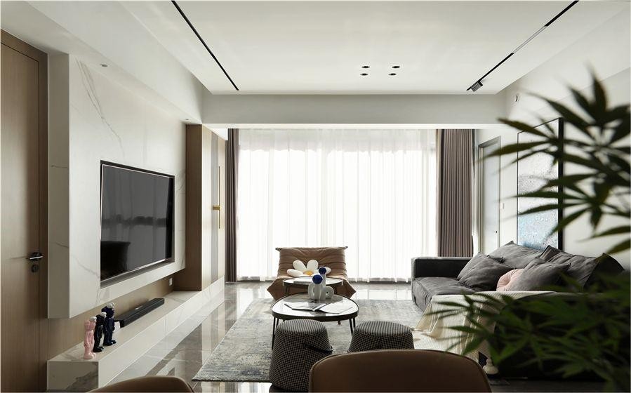 客厅整体以暖色调为主,木白色的墙面,瓷砖通铺,让空间看起来更加明亮。白色的纱帘透光不透人,不影响室内的采光,客厅设计简单没有过多的繁琐的设计。