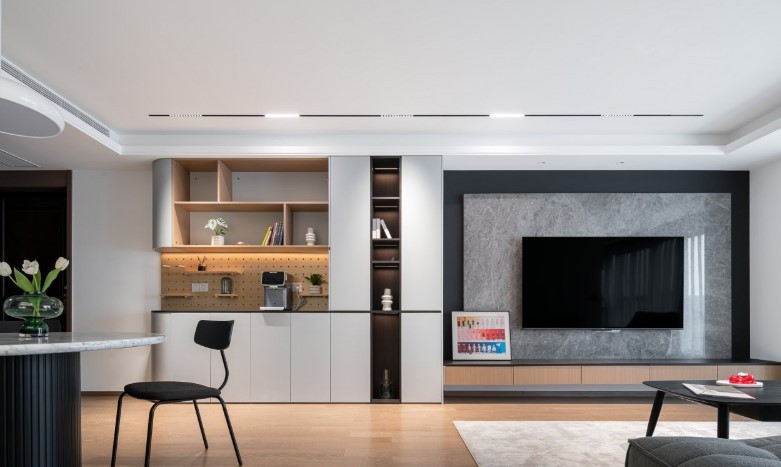凭借凹凸形态与张弛比例,构成了客厅立面的美学语言。延续留白之韵,没有过多的装饰,以具有诗意的线条为“钥”,拨动空间的风情,配合柔软的沙发和简雅的落地灯,减轻心里的烦忧。
