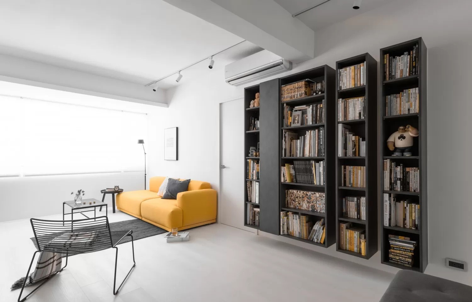 在背后用一个深颜色来定制一个书架来丰富空间。