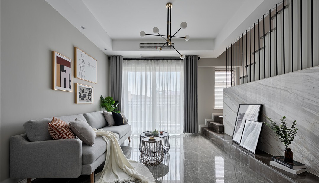 灰色双人沙发,简单舒适, 不规则挂画,圆形茶几,落地窗帘, 都必不可少。绿植给家里增添了勃勃生机。