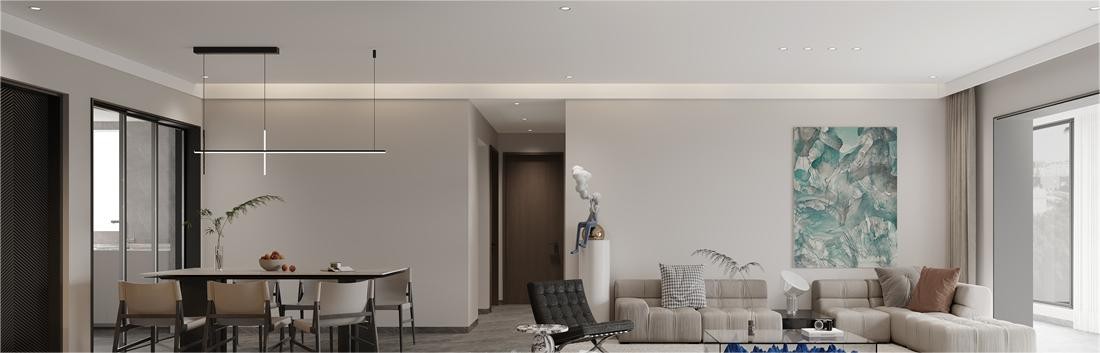 客厅主调简约素雅 清淡的配色抒写着柔和渐进的静谧美 深色调的点缀,将理性与感性较好的糅合 但凭风起影随,构筑空间的温馨与舒适