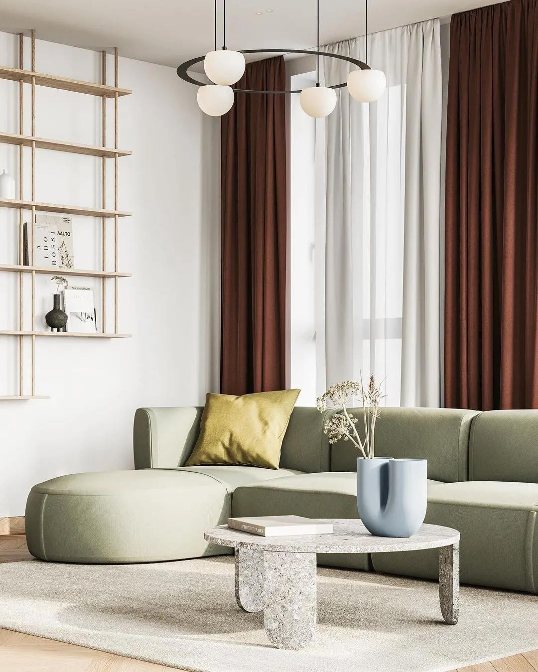 客厅为了搭配浅色调采用浅绿色的沙发,整体看上去很协调,空间的落地窗带来了优质的采光,白色的纱帘让光线变得更加柔和,空间中还加入了土黄和棕红等色调,空间虽然元素种类少但是色彩丰富,看上去简约而不简单。