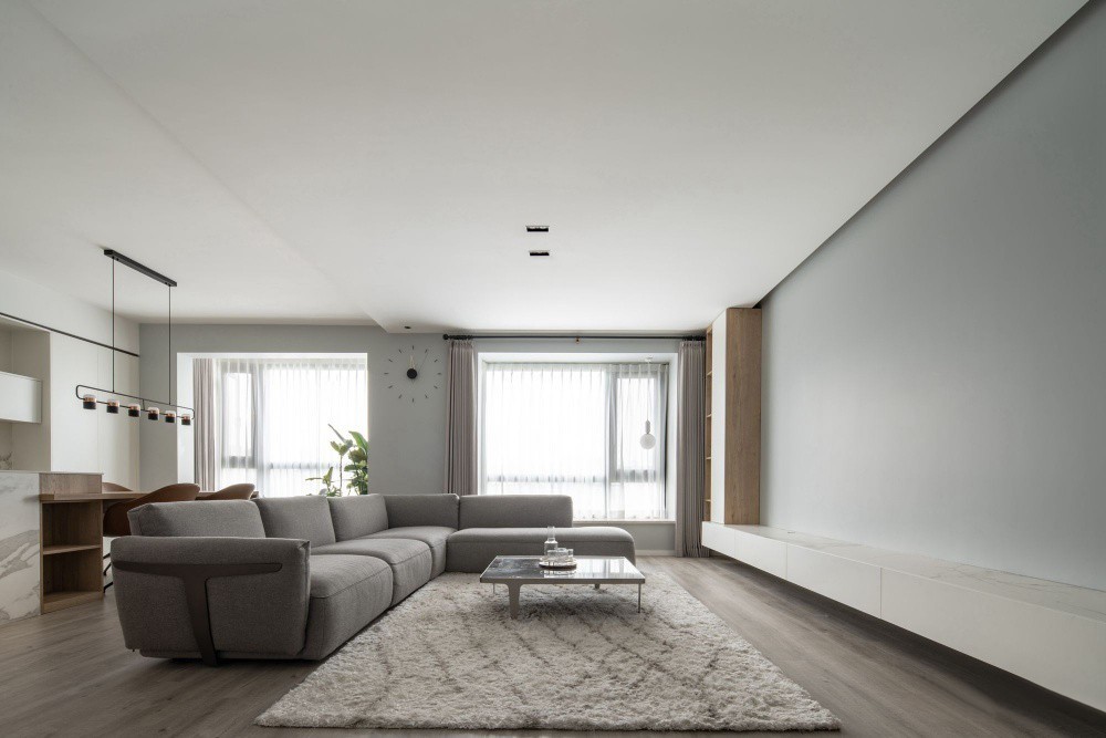 岛台与餐桌组合,充分满足一家三口生活习惯与使用需求。 大面积浅色奠定层次,浅色x分色混搭,呈现惬意的舒适感。