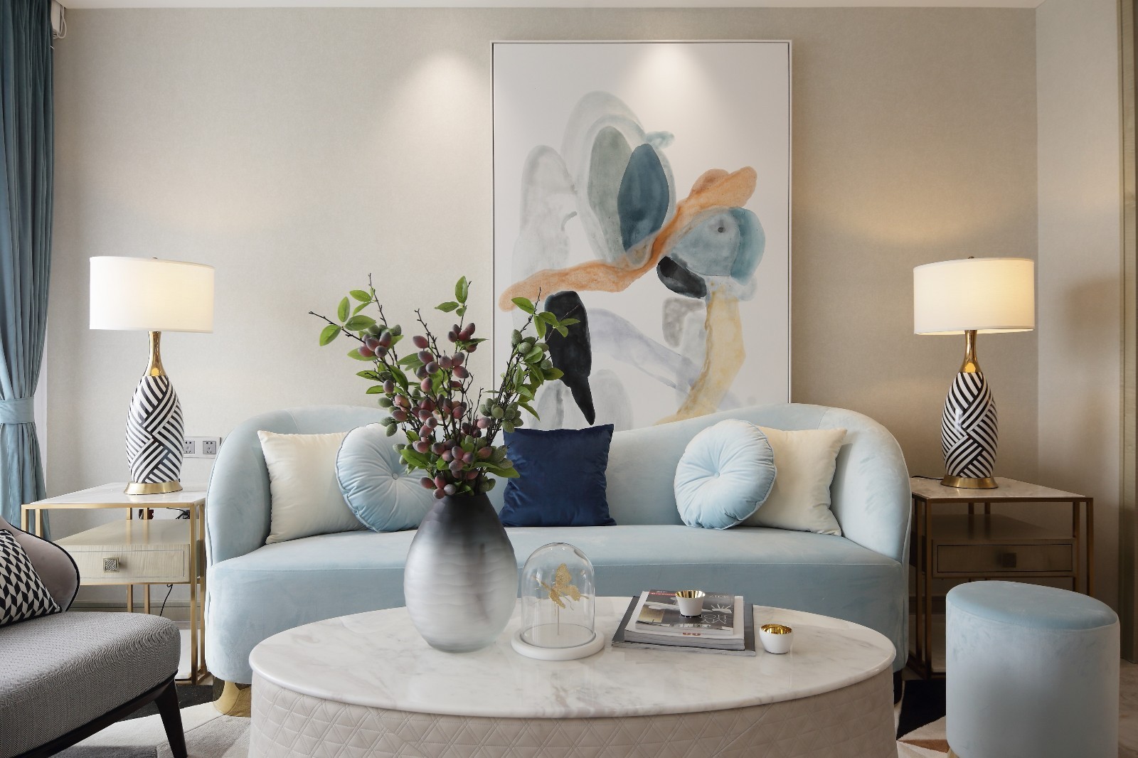 整体采用柔和的色调,金属做了点缀。用吊顶的层次感和软体的金属脚,拉伸空间
