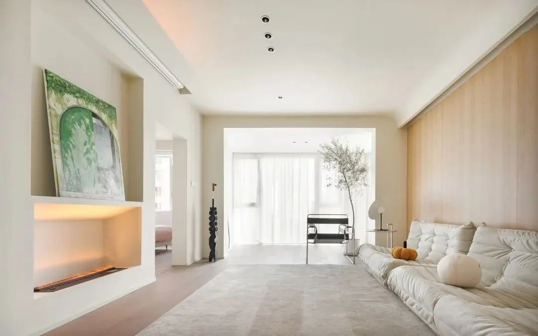 轻松感的客厅空间,简洁墙面加上质感原木的穿插,搭配全屋低饱和度家具,既有温馨感也富有层次。将阳台纳入客厅,一眼望去,只有纱帘下的阳光 。