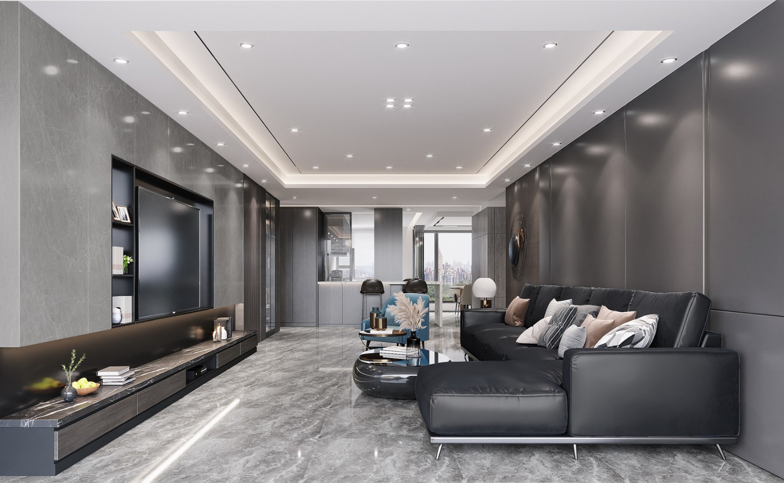 皮质沙发是这个空间的主角,灰色的沙发搭配浅色系的餐桌椅,使得整个空间更具立体感和层次感。无缝铺贴的地面设计,增强了整个空间的高端感。