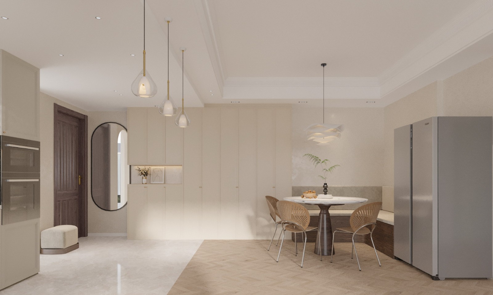 这是一个简约而又充满法式风情的室内设计。我们采用了实木地板,为空间带来了自然和温暖的氛围。在空间的一角设置了一个精致的吧台,让您可以享受一杯浓郁的咖啡或优雅的葡萄酒。🍷